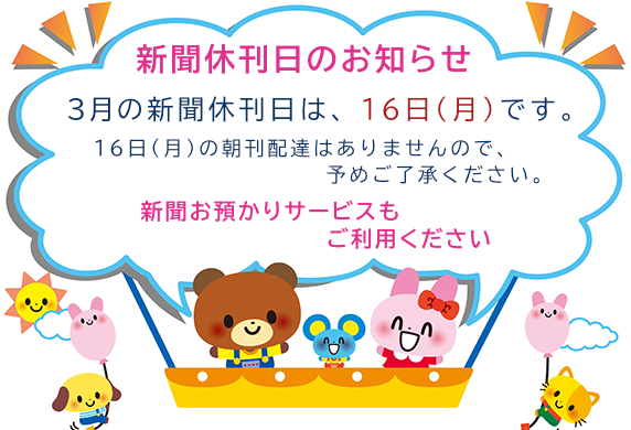 【休刊日のお知らせ】3月の新聞休刊日は、16日(月)です。16日(月)の朝刊配達はありませんので、予めご了承ください。
