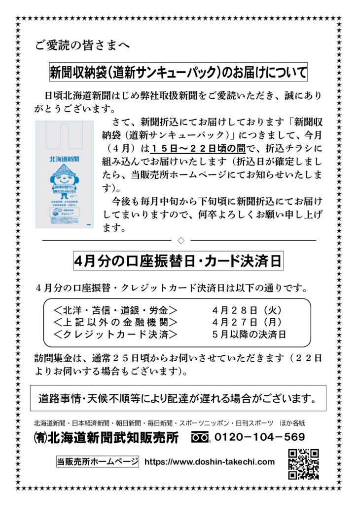 【休刊日のお知らせ】4月の新聞休刊日は、13日(月)です。13日(月)の朝刊配達はありませんので、予めご了承ください。